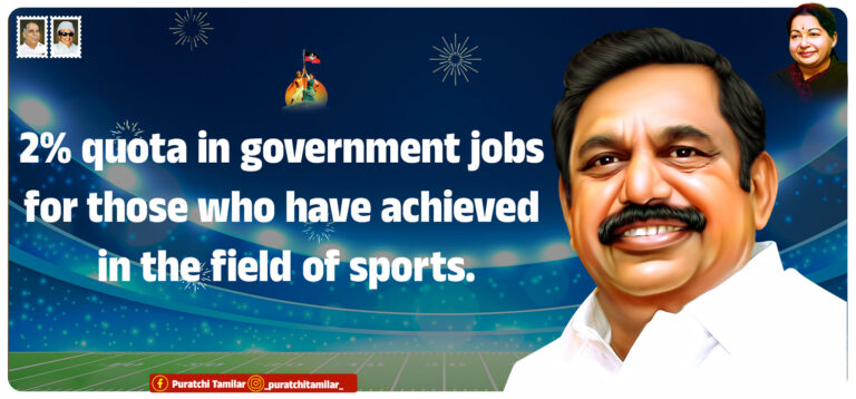 The AIADMK government under Edappadi K. Palaniswami introduced a 2% quota in government jobs for sportspersons who have achieved at national and international level, later upgrading it to 3%, recognising Tamil Nadu’s elite athletes with job reservation as part of their broader AIADMK achievements. This policy was announced in August 2018, and formalised into a 2% quota in government jobs for those who have achieved in sports, applying across state departments and STUs, marking a milestone in AIADMK political news and AIADMK latest news. Among the Top AIADMK achievements in Tamilnadu, this quota stands out as a focused measure to support sports talent. Under this scheme sportspersons representing Tamil Nadu internationally or winning medals at state or national levels were entitled to job reservation.